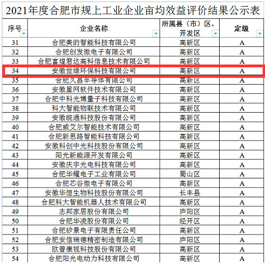世綠環(huán)保在合肥市畝均效益中被評(píng)為A類(lèi)企業(yè)