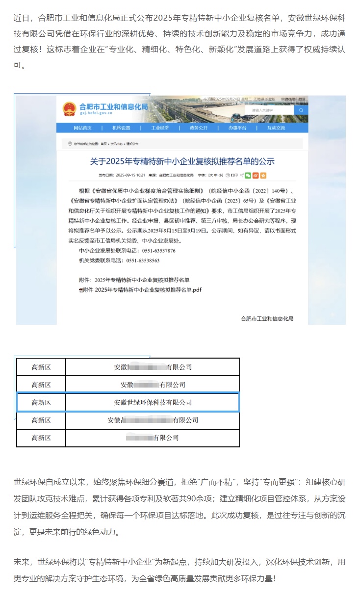 世綠環(huán)保成功通過(guò)“安徽省專精特新中小企業(yè)”復(fù)核,以專業(yè)守護(hù)綠水青山!