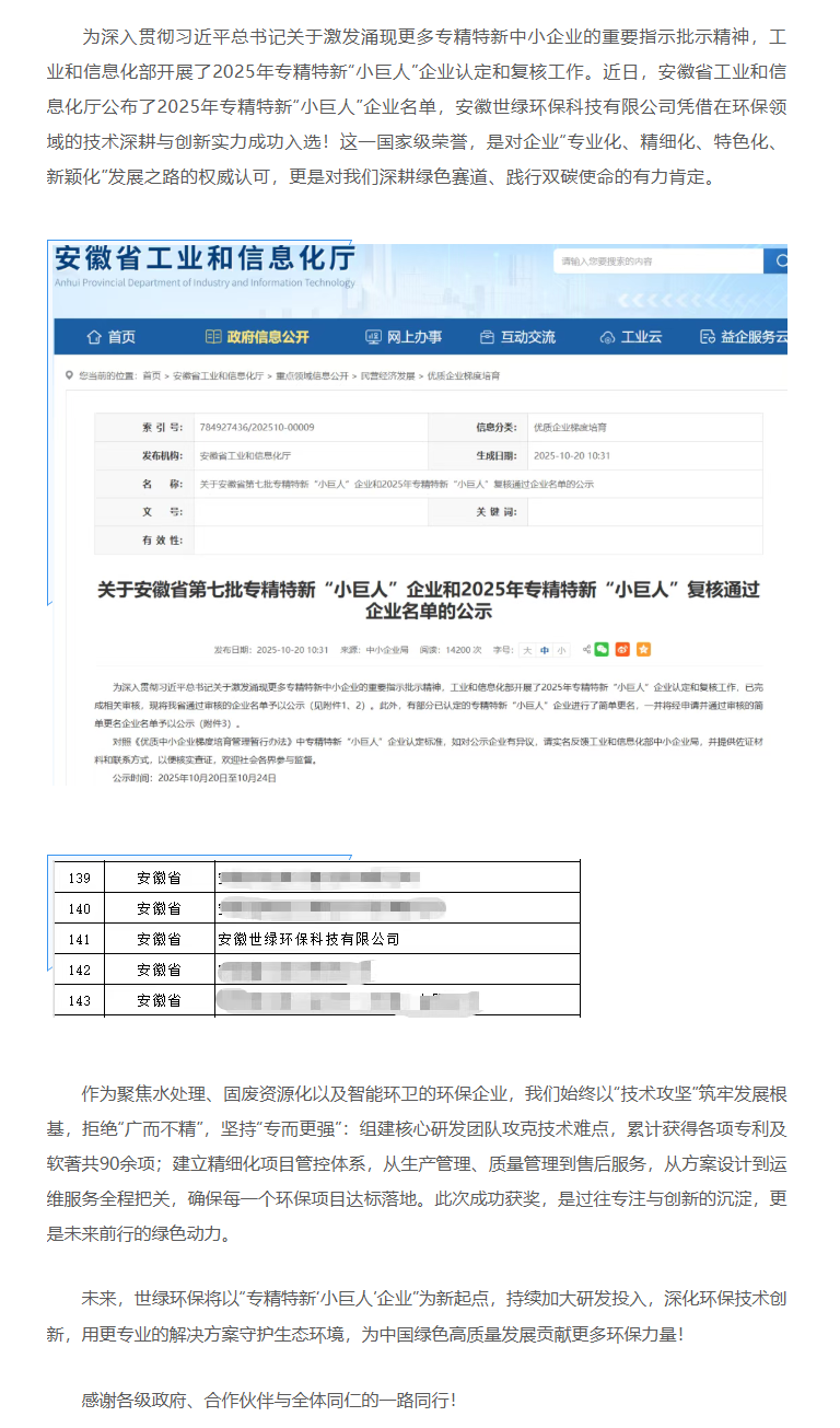 喜訊 | 世綠環(huán)保榮膺2025年國(guó)家級(jí)專精特新“小巨人”企業(yè)!